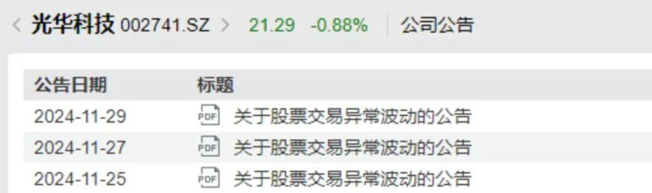 2024年11月24日、26日和28日,光华科技发布三份异动公告,均称“公司前期所披露的信息不存在需更正、补充之处”,且“经自查,公司不存在违反信息公平披露的情形”。