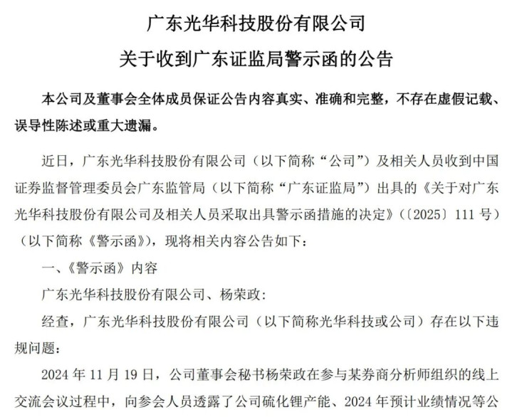 10月21日晚间,光华科技(002741.SZ,股价21.29元,市值99亿元)公告称,公司及相关人员收到广东证监局出具的《关于对广东光华科技股份有限公司及相关人员采取出具警示函措施的决定》(下称《警示函》)。